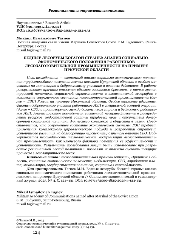 Цель исследования — системный анализ социально-экономического положения трудоспособного населения лесных поселков Иркутской области с особым акцентом на мотивацию к добровольному участию в военных действиях. В работе раскрываются причины снижения объемов заготовки древесины с точки зрения трудовой политики, социальной справедливости и экономической географии в контексте современного состояния лесозаготовительной промышленности (далее – ЛЗП) России на примере Иркутской области. Особое внимание уделяется фактам добровольного участия работников ЛЗП в специальной военной операции (далее – СВО) и противоречию между богатством страны и бедностью работников ЛЗП. Анализируются последствия системной несправедливости в распределении ресурсов, недостаточной защиты трудовых прав и отсутствия долгосрочной социальной политики для лесного комплекса и общества в целом. Представляется, что современное состояние экономической системы ЛЗП требует применения комплексного управленческого подхода и разработки стратегий устойчивого развития на долгосрочную перспективу с учетом влияния СВО. Подчеркивается необходимость технологической модернизации лесозаготовительной промышленности как ключевого фактора повышения ее эффективности и устойчивости. Результаты исследования могут быть использованы при разработке региональной лесной политики и позволят комплексно оценить текущие процессы в лесозащитных полосах.