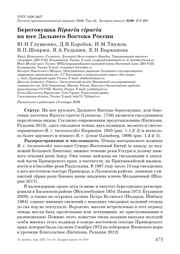 Береговушка Riparia riparia на юге Дальнего Востока России
