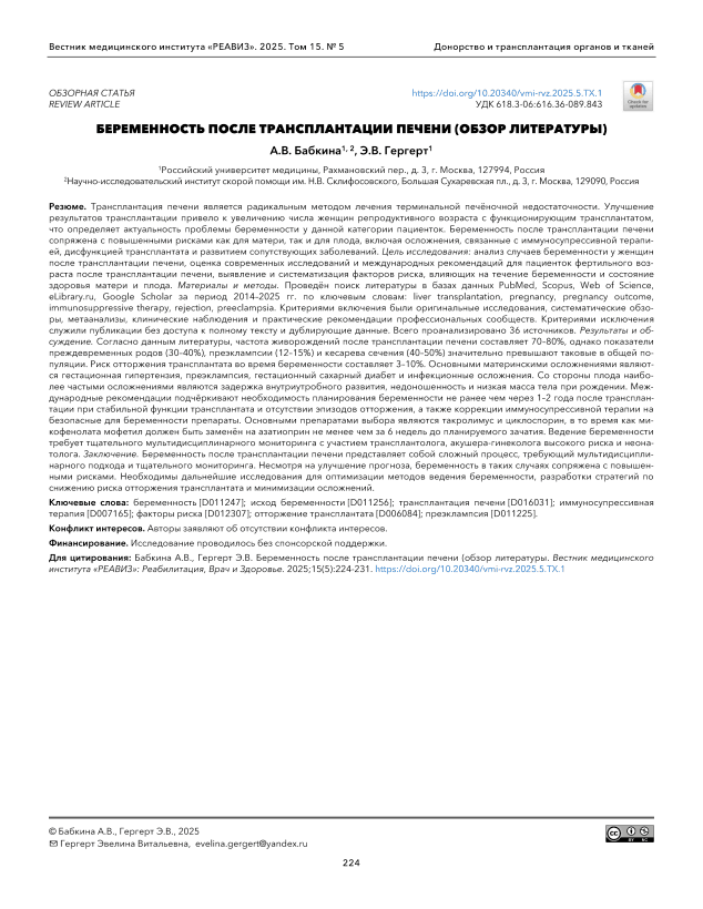 Трансплантация печени является радикальным методом лечения терминальной печёночной недостаточности. Улучшение результатов трансплантации привело к увеличению числа женщин репродуктивного возраста с функционирующим трансплантатом, что определяет актуальность проблемы беременности у данной категории пациенток. Беременность после трансплантации печени сопряжена с повышенными рисками как для матери, так и для плода, включая осложнения, связанные с иммуносупрессивной терапией, дисфункцией трансплантата и развитием сопутствующих заболеваний. Цель исследования: анализ случаев беременности у женщин после трансплантации печени, оценка современных исследований и международных рекомендаций для пациенток фертильного возраста после трансплантации печени, выявление и систематизация факторов риска, влияющих на течение беременности и состояние здоровья матери и плода. Материалы и методы. Проведён поиск литературы в базах данных PubMed, Scopus, Web of Science, eLibrary.ru, Google Scholar за период 2014–2025 гг. по ключевым словам: liver transplantation, pregnancy, pregnancy outcome, immunosuppressive therapy, rejection, preeclampsia. Критериями включения были оригинальные исследования, систематические обзоры, метаанализы, клинические наблюдения и практические рекомендации профессиональных сообществ. Критериями исключения служили публикации без доступа к полному тексту и дублирующие данные. Всего проанализировано 36 источников. Результаты и обсуждение. Согласно данным литературы, частота живорождений после трансплантации печени составляет 70–80%, однако показатели преждевременных родов (30–40%), преэклампсии (12–15%) и кесарева сечения (40–50%) значительно превышают таковые в общей популяции. Риск отторжения трансплантата во время беременности составляет 3–10%. Основными материнскими осложнениями являются гестационная гипертензия, преэклампсия, гестационный сахарный диабет и инфекционные осложнения. Со стороны плода наиболее частыми осложнениями являются задержка внутриутробного развития, недоношенность и низкая масса тела при рождении. Международные рекомендации подчёркивают необходимость планирования беременности не ранее чем через 1–2 года после трансплантации при стабильной функции трансплантата и отсутствии эпизодов отторжения, а также коррекции иммуносупрессивной терапии на безопасные для беременности препараты. Основными препаратами выбора являются такролимус и циклоспорин, в то время как микофенолата мофетил должен быть заменён на азатиоприн не менее чем за 6 недель до планируемого зачатия. Ведение беременности требует тщательного мультидисциплинарного мониторинга с участием трансплантолога, акушера-гинеколога высокого риска и неонатолога. Заключение. Беременность после трансплантации печени представляет собой сложный процесс, требующий мультидисциплинарного подхода и тщательного мониторинга. Несмотря на улучшение прогноза, беременность в таких случаях сопряжена с повышенными рисками. Необходимы дальнейшие исследования для оптимизации методов ведения беременности, разработки стратегий по снижению риска отторжения трансплантата и минимизации осложнений.
