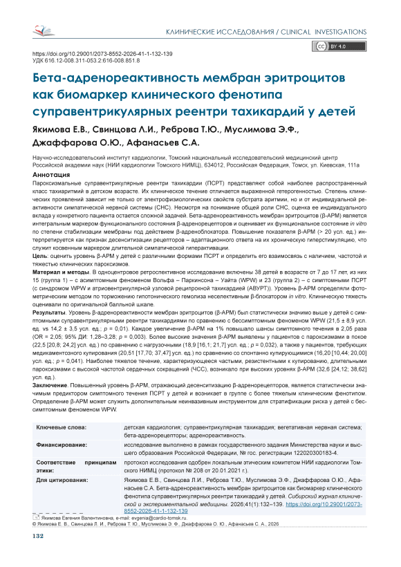Пароксизмальные суправентрикулярные реентри тахикардии (ПСРТ) представляют собой наиболее распространенный класс тахиаритмий в детском возрасте. Их клиническое течение отличается выраженной гетерогенностью. Степень клинических проявлений зависит не только от электрофизиологических свойств субстрата аритмии, но и от индивидуальной реактивности симпатической нервной системы (СНС). Несмотря на понимание общей роли СНС, оценка ее индивидуального вклада у конкретного пациента остается сложной задачей. Бета-адренореактивность мембран эритроцитов (β-АРМ) является интегральным маркером функционального состояния β-адренорецепторов и оценивает их функциональное состояние in vitro по степени стабилизации мембраны под действием β-адреноблокатора. Повышение показателя β-АРМ (> 20 усл. ед.) интерпретируется как признак десенситизации рецепторов – адаптационного ответа на их хроническую гиперстимуляцию, что служит косвенным маркером длительной симпатической гиперактивации. Цель: оценить уровень β-АРМ у детей с различными формами ПСРТ и определить его взаимосвязь с наличием, частотой и тяжестью клинических пароксизмов. Материал и методы. В одноцентровое ретроспективное исследование включены 38 детей в возрасте от 7 до 17 лет, из них 15 (группа 1) – с асимптомным феноменом Вольфа – Паркинсона – Уайта (WPW) и 23 (группа 2) – с симптомными ПСРТ (с синдромом WPW и атриовентрикулярной узловой реципрокной тахикардией (АВУРТ)). Уровень β-АРМ определяли фотометрическим методом по торможению гипотонического гемолиза неселективным β-блокатором in vitro. Клиническую тяжесть оценивали по оригинальной балльной шкале. Результаты. Уровень β-адренореактивности мембран эритроцитов (β-АРМ) был статистически значимо выше у детей с симптомными суправентрикулярными реентри тахикардиями по сравнению с бессимптомным феноменом WPW (21,5 ± 8,9 усл. ед. vs 14,2 ± 3,5 усл. ед.; p = 0,01). Каждое увеличение β-АРМ на 1% повышало шансы симптомного течения в 2,05 раза (OR = 2,05; 95% ДИ: 1,28–3,28; p = 0,003). Более высокие значения β-АРМ выявлены у пациентов с пароксизмами в покое (22,5 [20,8; 24,2] усл. ед.) по сравнению с нагрузочными (18,9 [16,1; 21,7] усл. ед.; p = 0,032), а также у пациентов, требующих медикаментозного купирования (20,51 [17,70; 37,47] усл. ед.) по сравнению со спонтанно купирующимися (16,20 [10,44; 20,00] усл. ед.; p = 0,041). Наиболее тяжелое течение, характеризующееся частыми, резистентными к купированию, длительными пароксизмами с высокой частотой сердечных сокращений (ЧСС), возникало при высоких уровнях β-АРМ (32,6 [24,12; 38,62] усл. ед.). Заключение. Повышенный уровень β-АРМ, отражающий десенситизацию β-адренорецепторов, является статистически значимым предиктором симптомного течения ПСРТ у детей и возникает в группе с более тяжелым клиническим фенотипом. Определение β-АРМ может служить дополнительным неинвазивным инструментом для стратификации риска у детей с бессимптомным феноменом WPW.