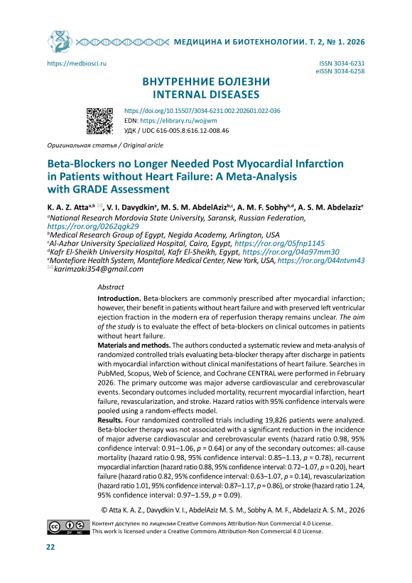 Введение. Бета-блокаторы обычно назначаются после инфаркта миокарда, однако их польза у пациентов без сердечной недостаточности и с сохраненной фракцией выброса левого желудочка в современную эпоху реперфузионной терапии остается неясной. Цель исследования – оценить влияние бета-блокаторов на клинические исходы у пациентов без сердечной недостаточности. Материалы и методы. Авторы провели систематический обзор и метаанализ рандомизированных контролируемых исследований, в которых оценивалась терапия бета-блокаторами после выписки у пациентов с инфарктом миокарда без клинических проявлений сердечной недостаточности. Поиск по данным PubMed, Scopus, Web of Science и Cochrane CENTRAL проводился в феврале 2026 г. Первичным исходом были серьезные неблагоприятные сердечные и цереброваскулярные события. Вторичные исходы включали смертность, повторный инфаркт миокарда, сердечную недостаточность, реваскуляризацию и инсульт. Отношения рисков с 95% доверительными интервалами были объединены с использованием модели случайных эффектов. Результаты. Были проанализированы четыре рандомизированных контролируемых исследования, включавшие 19 826 пациентов. Терапия бета-блокаторами не ассоциировалась со значимым снижением частоты серьезных неблагоприятных сердечных и цереброваскулярных событий (отношение риска 0,98, доверительный интервал 95 %: 0,91–1,06, p = 0,64) и ни одного из вторичных исходов: общей смертности (отношение риска 0,98, доверительный интервал 95 %: 0,85–1,13, p = 0,78), повторного инфаркта миокарда (отношение риска 0,88, доверительный интервал 95 %: 0,72–1,07, p = 0,20), сердечной недостаточности (отношение риска 0,82, доверительный интервал 95 %: 0,63–1,07, p = 0,14), реваскуляризации (отношение риска 1,01, доверительный интервал 95 %: 0,87–1,17, p = 0,86) или инсульта (отношение риска 1,24, доверительный интервал 95 %: 0,97–1,59, p = 0,09). Обсуждение и заключение. У пациентов с острым инфарктом миокарда без сердечной недостаточности и с сохраненной функцией левого желудочка рутинная терапия бета-блокаторами после выписки не ассоциировалась со снижением частоты серьезных неблагоприятных сердечных и цереброваскулярных событий или его отдельных компонентов в современных условиях реперфузионной терапии. Необходимы дальнейшие крупномасштабные исследования для выработки индивидуализированных подходов к терапии.