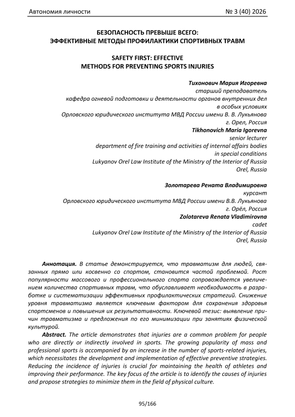 В статье демонстрируется, что травматизм для людей, связанных прямо или косвенно со спортом, становится частой проблемой. Рост популярности массового и профессионального спорта сопровождается увеличением количества спортивных травм, что обуславливает необходимость в разработке и систематизации эффективных профилактических стратегий. Снижение уровня травматизма является ключевым фактором для сохранения здоровья спортсменов и повышения их результативности. Ключевой тезис: выявление причин травматизма и предложения по его минимизации при занятиях физической культурой.