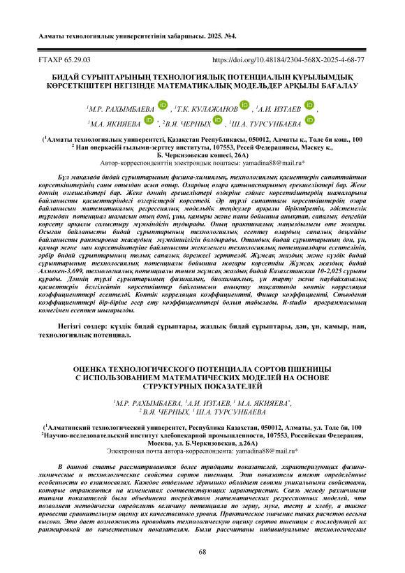 Бұл мақалада бидай сұрыптарының физика-химиялық, технологиялық қасиеттерін сипаттайтын көрсеткіштерінің саны отыздан асып отыр. Олардың өзара қатынастарының ерекшеліктері бар. Жеке дәннің өзгешеліктері бар. Жеке дәннің ерешеліктері өздеріне сәйкес көрсеткіштердің шамаларына байланысты қасиеттеріндегі өзгерістерді көрсетеді. Әр түрлі сипаттағы көрсеткіштердің өзара байланысын математикалық регрессиялық модельдік теңдеулер арқылы біріктіретін, әдістемелік тұрғыдан потенциал шамасын оның дәні, ұны, қамыры және наны бойынша анықтап, сапалық деңгейін көрсету арқылы салыстыру мүмкіндігін тудырады. Оның практикалық маңыздылығы өте жоғары. Осыған байланысты бидай сұрыптарының технологиялық есептеу олардың сапалық деңгейіне байланысты ранжировка жасаудың мүмкіншілігін болдырады. Отандық бидай сұрыптарының дән, ұн, қамыр және нан көрсеткіштеріне байланысты жекеленген технологиялық потенциалдары есептелініп, әрбір бидай сұрыптарының толық сапалық дәрежесі зерттелді. Жұмсақ жаздық және күздік бидай сұрыптарының технологиялық потенциалы бойынша жоғары көрсеткіш Жұмсақ жаздық бидай Алмекен-3,699, технологиялық потенциалы төмен жұмсақ жаздық бидай Казахстанская 10-2,025 сұрыпы құрады. Дәннің түрлі сұрыптарының физикалық, биохимиялық, ұн тарту және наубайханалық қасиеттерін белгілейтін көрсеткіштер байланысын анықтау мақсатында көптік корреляция коэффициенттері есептелді. Көптік корреляция коэффициентті, Фишер коэффициенті, Стьюдент коэффициенттері бір-біріне әсер ету коэффициенттері болып табылады. R-studio программасының көмегімен есептеп шығарылды.