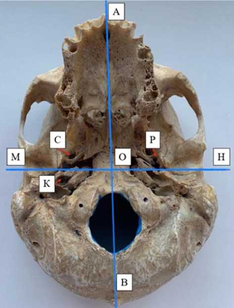 Там, где вертикальная линия «АВ» пересекала глоточный бугорок затылочной кости, проводили перпендикулярную ей линию «МН». Место пересечения этих линий (точка «О») служило отправной точкой для измерений. Далее, из точки «О» проводили линии через середину наружной апертуры сонного канала, овального отверстия и остистого отверстия справа и слева (рис. 1).