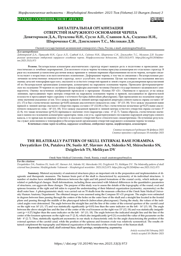 Девятириков Д.А., Путалова И.Н., Сусло А.П., Славнов А.А., Сиденко Н.И., Широченко С.Н., Дзигилевич Т.С., Меликян Д.В. Билатеральная организация отверстий наружного основания черепа. Морфологические ведомости. 2025;33(3):973. (3).973