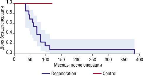 Рис. 2. Кривые выживаемости биопротеза в matched-группах (метод Каплана-Мейера). Примечание. Кривые выживаемости биологических протезов АК после проведения сопоставления методом Propensity Score Matching (Kaplan–Meier). В группе с деградацией отмечено достоверное снижение «выживаемости» протезов по сравнению с matched-контролем (log-rank test, p = 0.01).