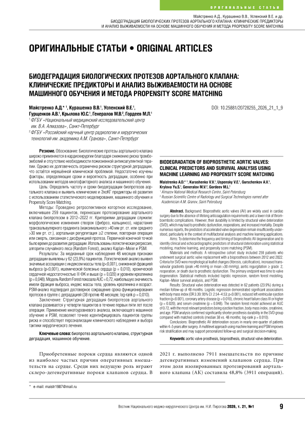 БИОДЕГРАДАЦИЯ БИОЛОГИЧЕСКИХ ПРОТЕЗОВ АОРТАЛЬНОГО КЛАПАНА: КЛИНИЧЕСКИЕ ПРЕДИКТОРЫ И АНАЛИЗ ВЫЖИВАЕМОСТИ НА ОСНОВЕ МАШИННОГО ОБУЧЕНИЯ И МЕТОДА PROPENSITY SCORE MATCHING нием современных статистических методов, машинного обучения и Propensity Score Matching.