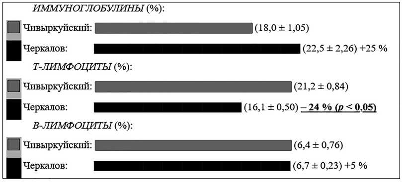 Сравнительный гематологический и иммунологический анализ сибирской плотвы из двух акваторий озера Байкал — залива Черкалов и условно-фонового Чивыркуйского залива — выявил ряд статистически значимых различий (рис. 2–3). У рыб из залива Черкалов зарегистрировано снижение общего числа лейкоцитов до 23 % ( р < 0,05) по сравнению с таковым особей чивыркуйской популяции. В лейкоцитарной формуле наблюдались следующие сдвиги. Относительное содержание лимфоцитов было выше в 1,1 раза (р < 0,05). В отличие от этого нейтрофильный росток кроветворения оказался подавленным. Численность клеток на всех стадиях дифференцировки у рыб из залива Черкалов была значимо снижена (в 4–7 раза, р < 0,05), в периферической крови отмечено отсутствие метамиелоцитов и миелоцитов в отличие от условно-фоновой группы. При оценке иммунологического статуса рыб у особей из залива Черкалов по сравнению с условно-фоновой группой наблюдалось статистически значимое снижение относительного числа Т-лимфоцитов (в 1,3 раза). Уровень В-лимфоцитов, индекс обилия лейкоцитов, содержание общего белка и иммуноглобулинов у плотвы черкаловской популяции варьировал в широких пределах и значимо не отличался между группами.
