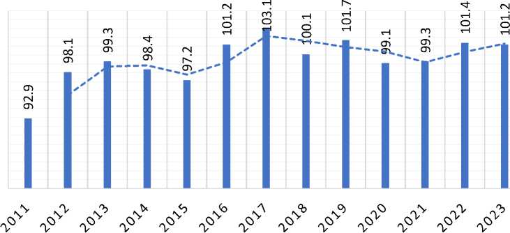 Современное состояние агропромышленного комплекса Республики Саха (Якутия) характеризуется неустойчивым состоянием и отсутствием динамичного развития. За последние 4 года индекс производства продукции сельского хозяйства колебался в пределах от 99% до 101,4% (рис. 1).