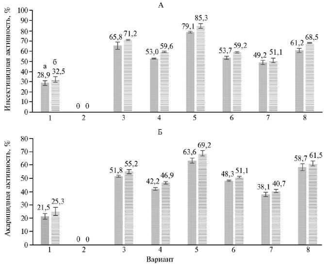 Рис. 1. Инсектицидная активность штаммов почвенных актинобактерий в отношении бахчевой тли Aphis gossypii (А) и акарицидная активность в отношении паутинного Tetranychus urticae (Б) после третьей (а) и четвертой (б) обработок огурца ( Cucumis sativus L.) сорта Форвард: 1 — положительный контроль, Фитоспорин-М (ПС), 2 — отрицательный контроль, водопроводная вода, 3 — суспензия 3-суточной культуры Nocardiopsis umidischolae RCAM04882, 4 — суспензия 3-суточной культуры N. umidischolae RCAM04883, 5 — суспензия 3-суточной культуры Streptomyces carpaticus RCAM04697, 6 — суспензия из сухой биомассы N. umidischolae RCAM04882, 7 — суспензия из сухой биомассы N. umidischolae RCAM04883, 8 — суспензия из сухой биомассы S. carpaticus RCAM04697 ( M ±SEM, N = 2, n = 16, опыт в закрытом грунте, филиал ФГБУ Российский сельскохозяйственный центр по Астраханской области, 2019 год).