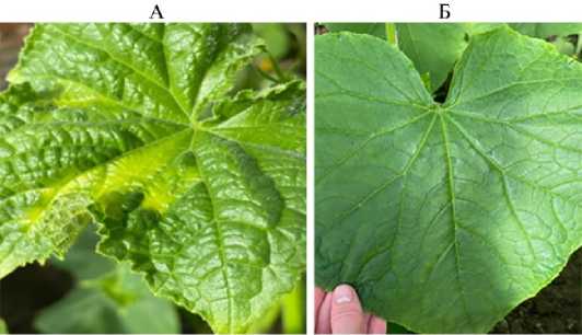 Рис. 2. Листья растений огурца ( Cucumis sativus L.) сорта Форвард при заражении вирусом огуреченой мозаики: А — отрицательный контроль (водопроводная вода), Б — обработка суспензией штамма Streptomyces carpaticus RCAM04697 (опыт в закрытом грунте, филиал ФГБУ Российский сельскохозяйственный центр по Астраханской области, 2021 год).
