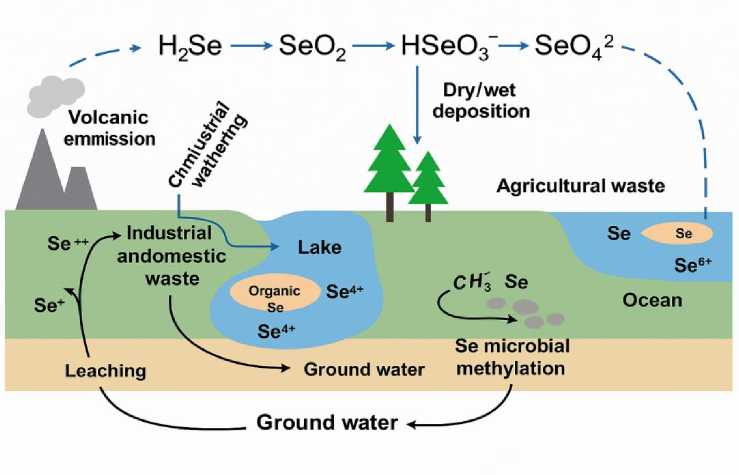 Биогеохимический цикл селена (рис. 1) относится к естественному перемещению и трансформации селена через атмосферу, литосферу, гидросферу, биосферу и включает в себя как органические, так и неорганические формы селена ( Yang et al., 2022 ).