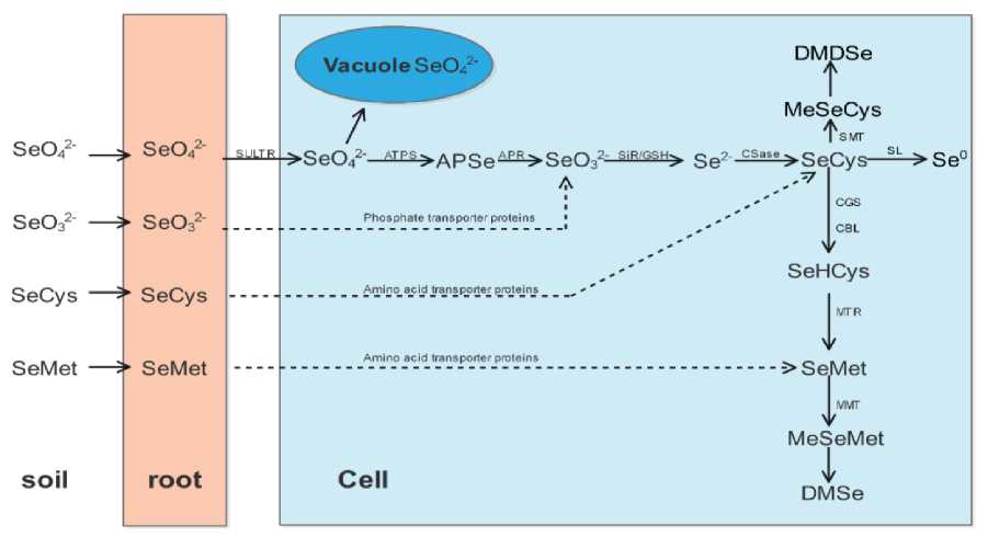 Попадая в клетку растения через корни, неорганический Se быстро преобразуется в органические формы. Растения восстанавливают селенат до селенита (с помощью АТФ-сульфурилазы), а затем до селенида, который участвует в метаболизме серы. В конечном итоге Se включается в состав аминокислот, главным образом селеноцистеина и селенометионина, а также в состав белков вместо серы. Из-за этих процессов большая часть Se в тканях съедобных растений находится в органической форме (Se-AAs) ( Zhang et al., 2006 ).