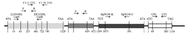 Взаимное расположение трех генов митохондриальной ДНК Rhopalosiphum padi L. и места посадки пяти пар праймеров, используемых для секвенирования участков этих генов. Светло-серым обозначен ген COI, пары праймеров LCO1490—HC02198 (85), C1-J-1751—C1-N-2191 (86), LepF— LepR (87), F—R (84); темно-серым — ген COII, пара праймеров F—R (84); темно-серым — ген ND4, пара праймеров RpND4-F—RpND4-R (89), белым в черной рамке — ген Cytb, пара праймеров CP1—CP2 (88). Стрелками показаны области отжига праймеров; цифры под стрелками соответствуют положению первого нуклеотида на 5´-конце праймера; нумерация нуклеотидов начинается со стартового кодона. Названия праймеров указаны над стрелками. В качестве референсной последовательности была взята последовательность митогенома R. padi KT447631.1 из базы данных NCBI (National Center for Biotechnology, .