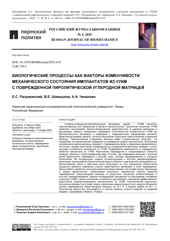 Углерод-углеродные-композиционные материалы (далее – УУКМ) являются перспективными для применения в области имплантологии. Технология получения УУКМ позволяет регулировать физико-механические характеристики в широком диапазоне и варьировать область применения материала. Отличительной особенностью УУКМ как функционального материала в сравнении с традиционными материалами является характерный разброс свойств, который обусловлен структурой пиролитической углеродной матрицы. Пиролитическая углеродная матрица имеет стохастическую структуру, что определяет ее механическое поведение на размерном уровне кристаллитов. Флуктуации напряжений в зернах матрицы приводят к повреждениям зерен и изменению механического состояния, причем накопление повреждений до определенной величины приводит к росту несущей способности имплантата из УУКМ. Повреждения реализуются в определенных областях имплантата из УУКМ. Накопление повреждений в локализованных областях приводит матрицу к гранулированному виду. В зонах, где повреждена матрица, с высокой долей вероятности повреждена и костная ткань, которая сформировалась в процессе остеогенеза. На последующих стадиях остеоинтеграции и костного ремоделирования, происходит проникновения биологической среды в области с увеличенной проницаемостью. Проникновение клеток и факторов роста происходит по типу перколяции. Результатом процессов является изменение упругих характеристик материала в зоне повреждений. Целью работы является получение асимптотических формул на основе теории перколяции и теории вероятностей, позволяющих вычислить измененные упругие свойства поврежденной пироуглеродной матрицы в результате процессов остеоинтеграции и костного ремоделирования. Данное исследование направлена на расширение понимания структуры УУКМ, с целью улучшения их свойств и дальнейшего повышения эффективности результатов эндопротезирования имплантатами из УУКМ. Аналитические результаты полученных формул на основе теории перколяции демонстрируют рост модуля объемного сжатия поврежденной пироуглеродной матрицы на 16,1 %, а модуля сдвига на 28,1 %. Полученные результаты вписываются в строгие границы упругих модулей по моделям Хашина – Штрикмана и Фойгта – Ройсса.