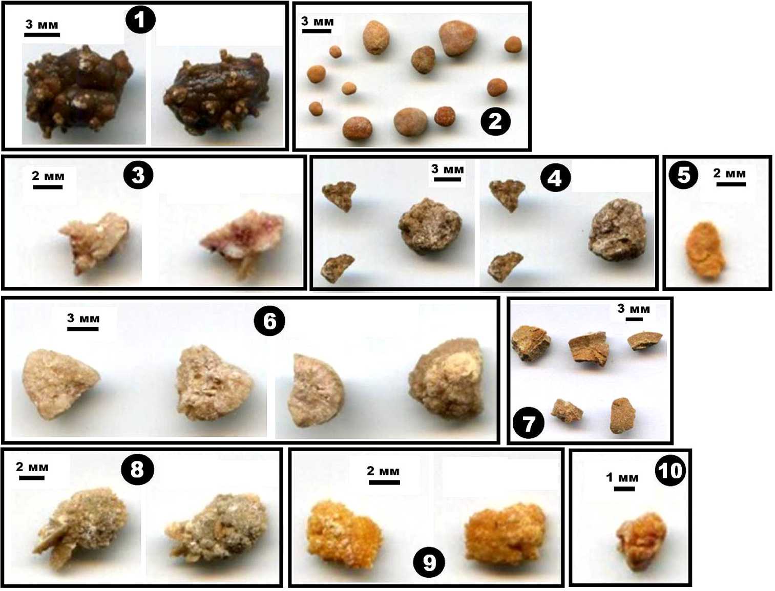 Рис. 1. Фотоизображения исследуемых мочевых камней. Номера изображений совпадают с номерами образцов в табл. 1