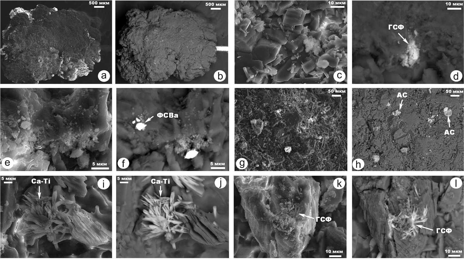 Рис. 10 . СЭМ-изображения внутреннего строения обр. № 9 мочевых камней в режимах вторичных (a, c, e, g, i, k) и упругоотраженных (b, d, f, h, j, l) электронов. Фазы: Ca-Ti — сульфато-силикатофосфаты; ФCВа — фосфатосульфаты бария; ГСФ — гидроген-сульфатофосфаты