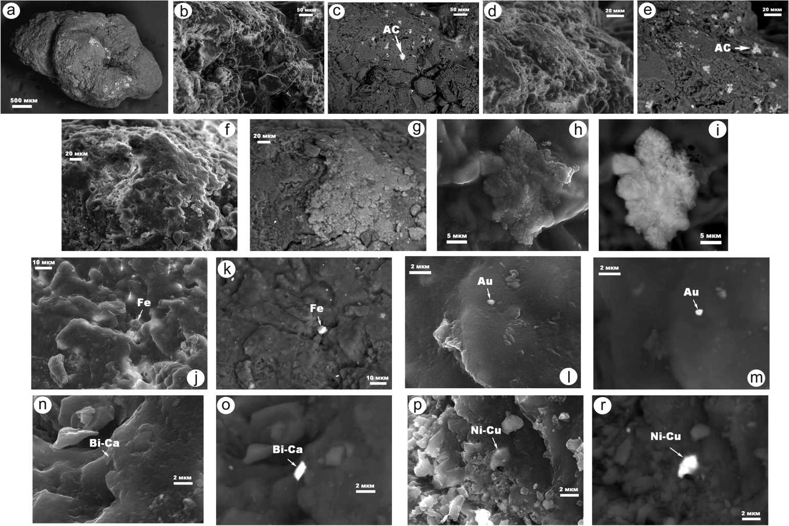 Fig. 11. SEM images of the internal structure of urinary stones of sample No. 10 in the secondary (a, b, d, f, h, j, l, n, p) and elastically reflected (c, e, g, i, k, m, o, r) electron modes. Phases: AC — silicates and aluminosilicates; Fe, Au — precipitates of native metals; Bi-Ca, Ni-Cu — organometallic compounds