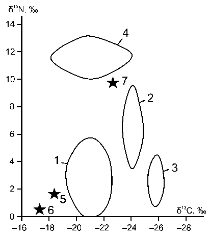 Рис. 15 , Статистика изотопного состава углерода и азота в органическом веществе мочевых камней и образцах мочи: 1 — мочевые камни; 2 — моча пациентов с мочекаменной болезнью; 3 — моча пациентов с хроническим пиелонефритом; 4 — кости человека; 5—7 — мочевые камни сульфатно-уратно-фосфатные (5), уратно-суль-фатно-фосфатные (6) и опал-фосфатные (7) (по: Силаев, Кокин, 2021)