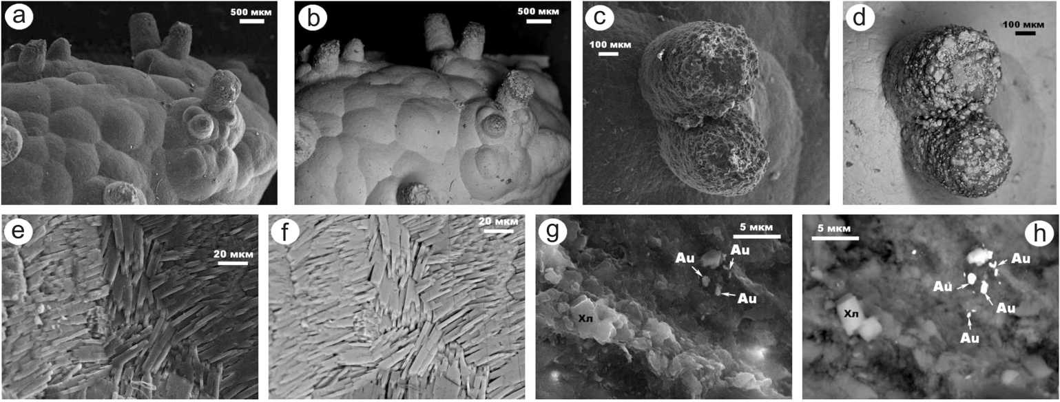 Рис.2 . СЭМ-изображения внутреннего строения обр. № 1 мочевых камней в режимах вторичных (a, c, e, g) и упругоотраженных (b, d, f, h) электронов. Фазы: Au — выделения самородного золота