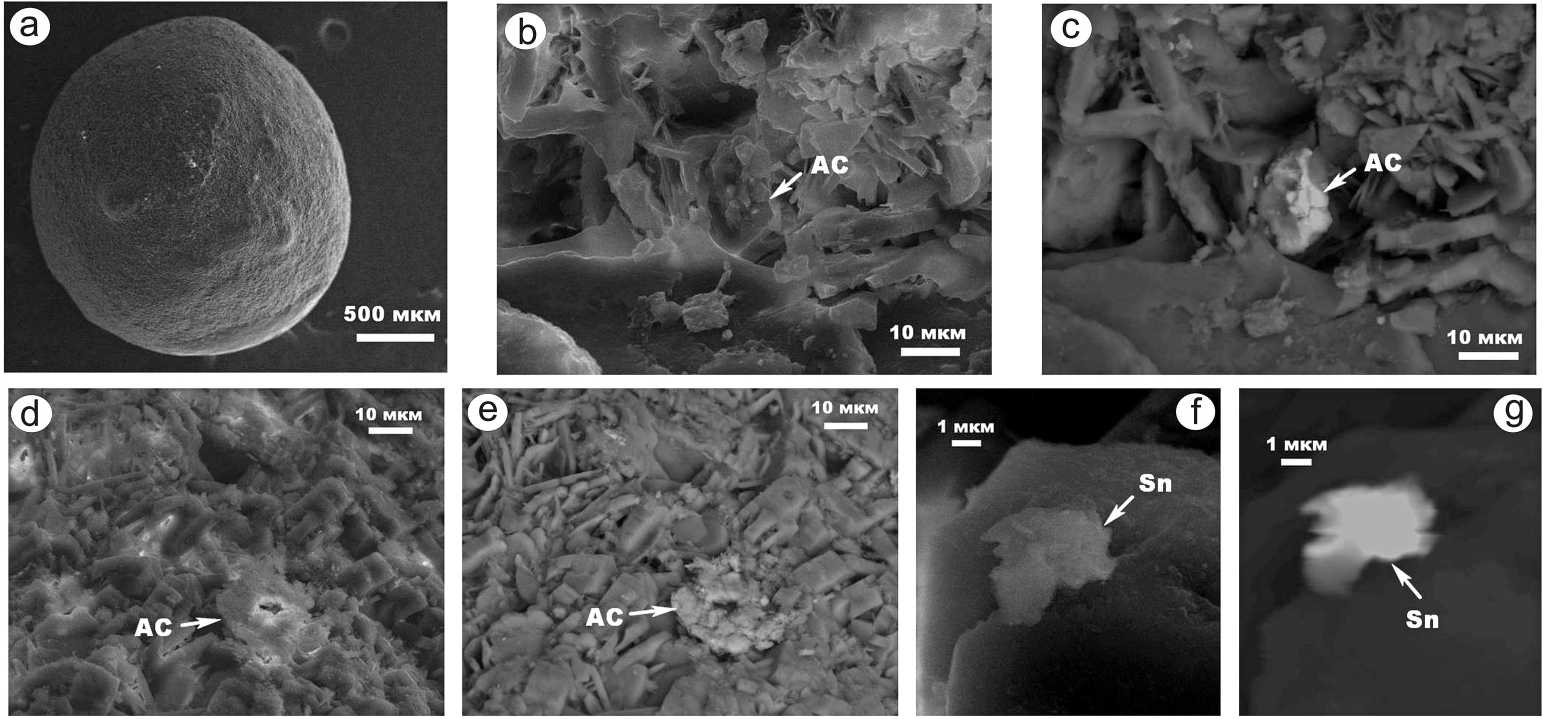 Рис. 3 . СЭМ-изображения внутреннего строения обр. № 2 мочевых камней в режимах вторичных (a, b, d, f) и упругоотраженных (c, e, g) электронов. Фазы: АС — силикаты и алюмосиликаты, Sn — выделения самородных металлов