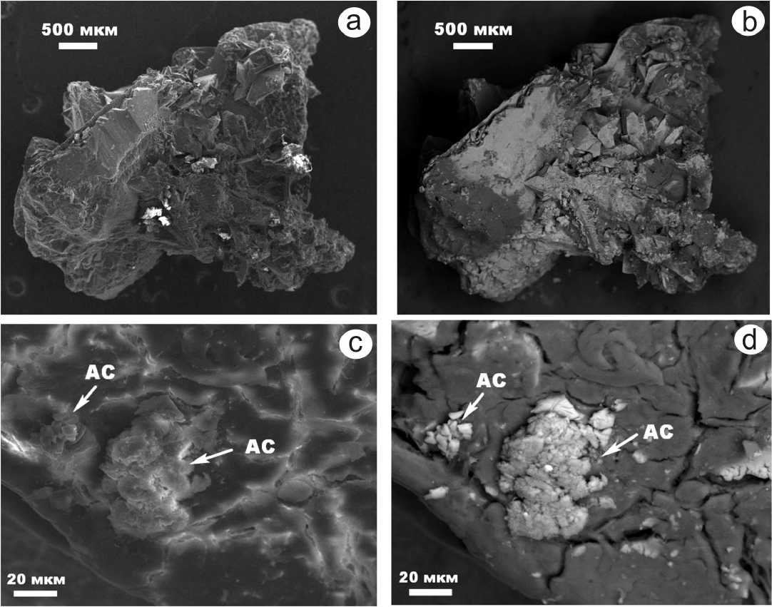 Fig. 4. SEM images of the internal structure of urinary stones of sample No. 3 in the secondary (a, c) and elastically reflected (b, d) electron modes. Phases: AC — silicates and aluminosilicates
