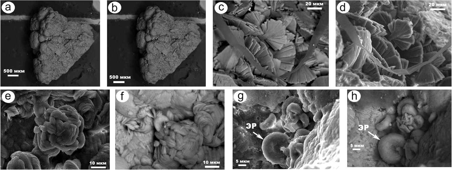 Рис. 5 . СЭМ-изображения внутреннего строения образца № 4 мочевых камней в режимах вторичных (a, c, e, g) и упругоотраженных (b, d, f, h) электронов. Фазы: ЭР — эритроциты