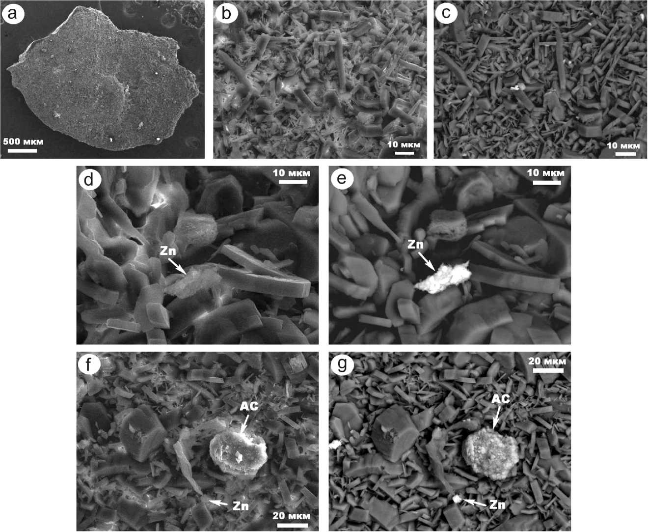 Fig. 6. SEM images of the internal structure of urinary stones of sample No. 5 in the secondary (a, b, d, f) and elastically reflected (c, e, g) electron modes. Phases: AC — silicates and aluminosilicates, Zn — native metal precipitation