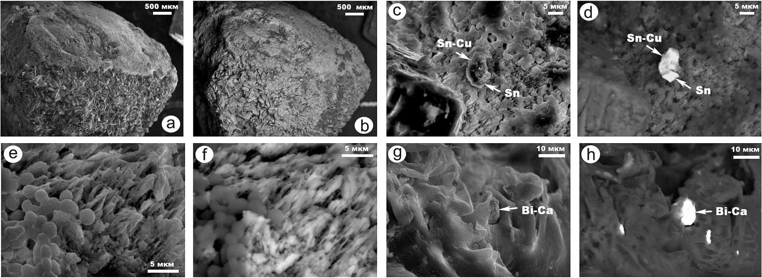 Рис. 7 . СЭМ-изображения внутреннего строения обр. № 6 мочевых камней в режимах вторичных (a, c, e, g) и упругоотраженных (b, d, f, h) электронов. Фазы: Sn-Cu и Sn — выделения самородных металлов; Bi-Ca — металлоорганические соединения
