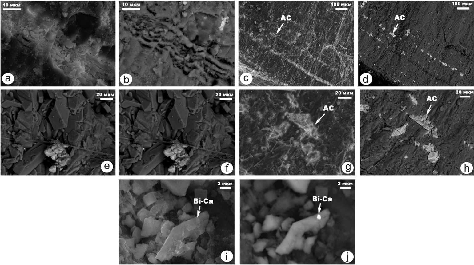 Рис. 8 . СЭМ-изображения внутреннего строения обр. № 7 мочевых камней в режимах вторичных (a, c, e, g, i) и упругоотраженных (b, d, f, h, j) электронов. Фазы: АС — силикаты и алюмосиликаты; Bi-Ca — металлоорганические соединения
