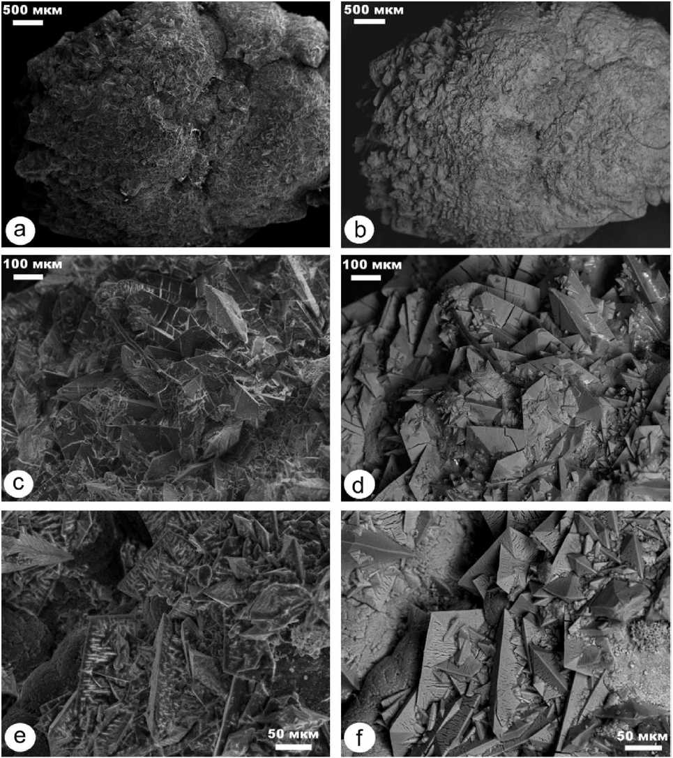 Рис. 9 . СЭМ-изображения внутреннего строения обр. № 8 мочевых камней в режимах вторичных (a, c, e) и упругоотраженных (b, d, f) электронов