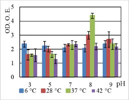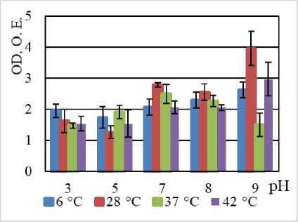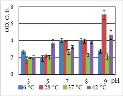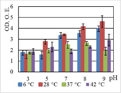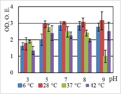По нашим данным, максимальная продукция биопленки наблюдается у всех штаммов в температурном оптимуме их роста: B. halodurans MH-3011N – при 37°С, B. niacini TC-8101S – 30°С, B. alcalophilus WS-3027B – 30°С, B. funiculus LY-2403G – 22°С, B. psychrodurans LV-1106E – 22°С, C. flaccumfaciens AE-0851V – 30°С [Bacterial Diversity: эл. ресурс]. Среди изучаемых углеводородокисляющих микроорганизмов 2 штамма – Bacillus alcalophilus WS-3027B и C. flaccumfaciens AE-0851V – характеризуются плотной продукцией биопленки по (Stepanovic, Vuković, Hola [2007]), остальные 4 штамма – B. halodurans MH-3011N, B. niacini TC-8101S, B. funiculus LY-2403G, B. psychrodurans LV-1106E характеризуются умеренной продукцией биопленки (см. таблицу). Для большинства исследованных штаммов максимальная продукция биопленки наблюдалась при нейтральных и щелочных показателях среды. Это согласуется с литературными данными об адаптации гало- и алкалофильных бактерий к высоким значениям рН, к кото- рым относятся B. halodurans MH-3011N, B. alcalophilus WS-3027B, к высоким значениям рН [Irwin, 2020;