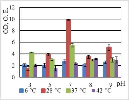 Наибольшая продукция биопленки наблюдается в нейтральной среде (рН 7) и в щелочной среде (рН 9) при температуре 28°С. Штамм характеризуется плотной продукцией биопленки (ODc>4). |