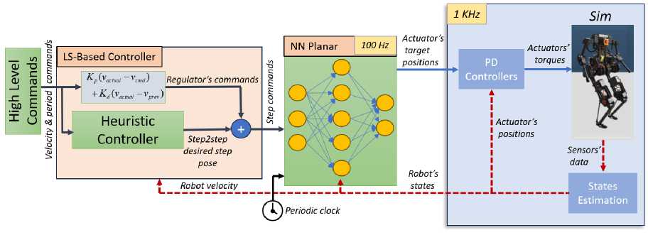 Рис. 1. Архитектура системы управления локомоцией бипедального робота. Метод использует эвристический планировщик шагов для определения позиций стоп, планировщик включает эвристику Райберта для точного отслеживания желаемой скорости