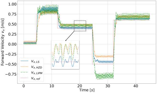 Было произведено сравнение производительности исследуемых методов при следовании за заданным профилем поступательной скорости во время ходьбы по ровной поверхности, как показано на рис. 3. В таблице 2 приведены средняя абсолютная ошибка (МАЕ) и стандартное отклонение поступательной скорости центра масс при заданной скорости 0.5 м/с, измеренные за 100 шагов с длительностью одного шага 0.25 с. LS-подход достигает МАЕ, равной 0.0136 м/с, что примерно на 80% меньше, чем у других методов, что свидетельствует о значительно более высокой точности. Также наблюдается наименьшее стандартное отклонение (0.0141 м/с), что указывает на стабильную работу контроллера.