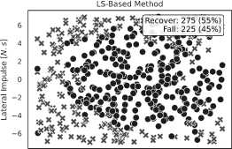 Вероятность восстановления равновесия в табл. 5. На рис. 4 показано распределение положений, в которых робот либо падал, либо успешно восстанавливался при Lmaх = 7 Н с. Результаты показывают, что метод на основе LS превосходит другие подходы.