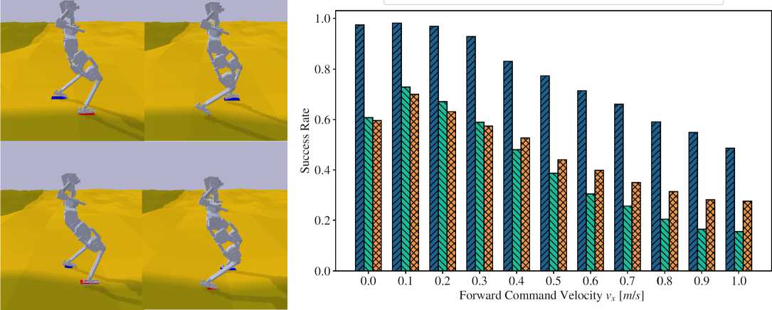 Мы обучили все контроллеры работать в условиях, предполагающих вариацию длительности шага (или, эквивалентно, частоты шагания) в диапазоне от 0.2 до 0.4 секунд. В целом роботы успешно адаптировались к этим изменениям, демонстрируя устойчивое поведение во всём диапазоне.