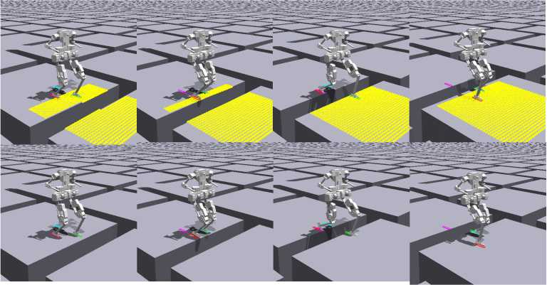 Для демонстрации эффективности предлагаемого метода была проведена оценка поведения робота на поверхности с разрывами при использовании той же политики, обученной на ровной поверхности в среде симуляции IsaacGym. Восприятие рельефа осуществляется на основе карты высот, что соответствует условиям обучения при передвижении по лестнице. При обнаружении разрыва в области следующего запланированного шага робот смещает стопу к ближайшей допустимой плоской поверхности. Аналогичный подход был использован в [13] для обеспечения преодоления разрывов шагающими роботами. На рисунке 6 показано, как робот успешно передвигается по поверхности с разрывами, следуя сгенерированным командам шагов на скорости ходьбы 0.6 м/с. Это демонстрирует эффективность предлагаемого метода в поддержании устойчивости и динамическом изменении положений стоп при движении по прерывистой поверхности.