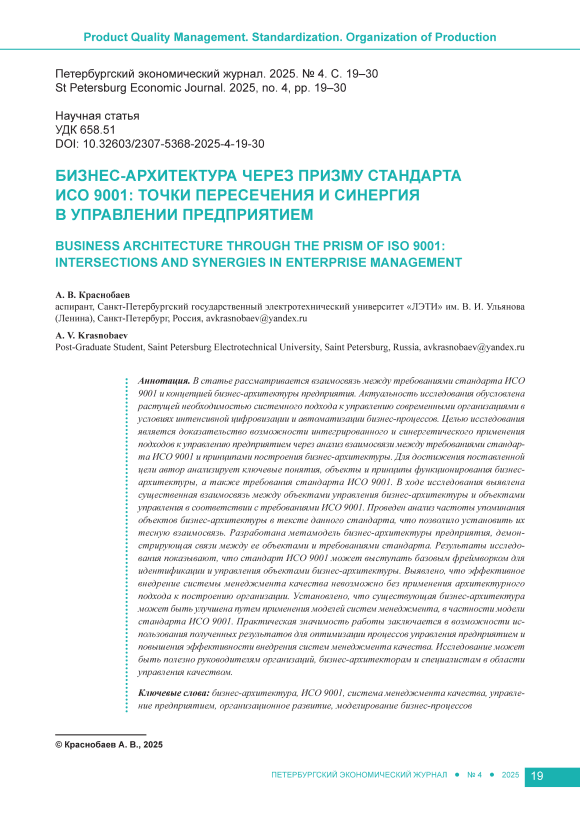 В статье рассматривается взаимосвязь между требованиями стандарта ИСО 9001 и концепцией бизнес-архитектуры предприятия. Актуальность исследования обусловлена растущей необходимостью системного подхода к управлению современными организациями в условиях интенсивной цифровизации и автоматизации бизнес-процессов. Целью исследования является доказательство возможности интегрированного и синергетического применения подходов к управлению предприятием через анализ взаимосвязи между требованиями стандарта ИСО 9001 и принципами построения бизнес-архитектуры. Для достижения поставленной цели автор анализирует ключевые понятия, объекты и принципы функционирования бизнесархитектуры, а также требования стандарта ИСО 9001. В ходе исследования выявлена существенная взаимосвязь между объектами управления бизнес-архитектуры и объектами управления в соответствии с требованиями ИСО 9001. Проведен анализ частоты упоминания объектов бизнес-архитектуры в тексте данного стандарта, что позволило установить их тесную взаимосвязь. Разработана метамодель бизнес-архитектуры предприятия, демонстрирующая связи между ее объектами и требованиями стандарта. Результаты исследования показывают, что стандарт ИСО 9001 может выступать базовым фреймворком для идентификации и управления объектами бизнес-архитектуры. Выявлено, что эффективное внедрение системы менеджмента качества невозможно без применения архитектурного подхода к построению организации. Установлено, что существующая бизнес-архитектура может быть улучшена путем применения моделей систем менеджмента, в частности модели стандарта ИСО 9001. Практическая значимость работы заключается в возможности использования полученных результатов для оптимизации процессов управления предприятием и повышения эффективности внедрения систем менеджмента качества. Исследование может быть полезно руководителям организаций, бизнес-архитекторам и специалистам в области управления качеством.