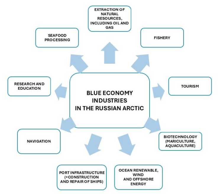 Studies devoted to the applicability of the Blue Economy to the Arctic Zone of the Russian Federation also identify the Blue Economy of the Arctic as an economy of the sea [9, Druzhinin A.G., Lachininskii S.S.] or see it as a tool for sustainable development, noting the need to develop government and business projects [10, Kokurina A.D., Monastyrskiy D.I.], focused on the Arctic sea area, the development of shipping and seaports, decarbonization, further digitalization, the use of new technologies and the creation of sustainable supply chains [11, Krivichev A.I., Nyudleyev D.D., Sidorenko V.N., pp. 415–424]. G. Tianming and co-authors note that the Russian Arctic is characterized not only by its marine economy, but also by a number of coastal activities related to the sea (aquaculture, shipping, offshore oil and gas production, etc.) or affect marine bioenergy (e.g., reduction of emissions into the coastal atmosphere and water, waste management, coastal tourism, creation of nature reserves and parks, etc.) [12].