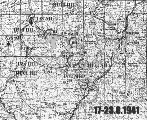 Figure 2. Map of the fighting on 17–23 August 1941 (drawn by the author based on a 1985 Soviet topographic map)