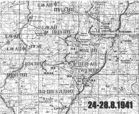 Figure 3. Map of the fighting on 24–28 August 1941 (drawn by the author based on a 1985 Soviet topographic map)