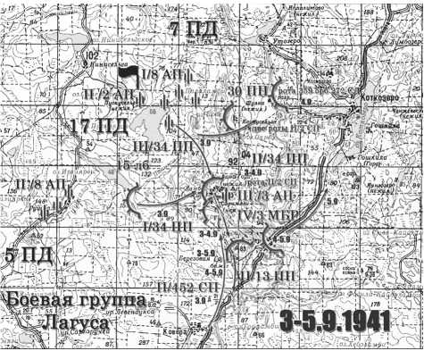Ранним утром 3 сентября боевая группа Перк-сало при поддержке артгруппы Раурамо (три артдивизиона – восемь 122-мм (сов.), четыре 114-мм (брит.) гаубиц, шестнадцать 84-мм (брит.), восемь 76-мм (сов.) пушек) атаковала позиции моряков и ополченцев на стыке групп Цветаева и Антонюка. Застава, оборонявшая высоты 49,1 и 52,4, отошла под натиском противника в район Сармяги. 2-й батальон ополченцев вступил в бой за Конду-Сельгу и Ильину Гору. Моряки вели бой в полуокружении, обороняя Сармяги и Уткину Гору. Им на помощь был выдвинут последний резерв Южной группы – 2-й батальон 452-го мотострелкового полка (160 человек). 4-я и 5-я роты усилили ополченцев и моряков, а 6-я заняла оборону в Торосозере. Группа Перксало неоднократно атаковала Ильину Гору, Вехку-Сельгу, Сармяги, но успеха не имела. К исходу дня моряки и ополченцы удерживали рубеж: мельница – Ильина Гора – Вехку-Сельга – Сармя-ги16. В ожесточенных боях за Сармяги 3-й АДН и бронеавтомобили моряков подбили несколько танков противника. В ходе боя были ранены командир батальона старший лейтенант А. Смирнов и комиссар батальона старший политрук В. Приставка. Командование батальоном принял командир 3-й роты лейтенант П. А. Анохин.