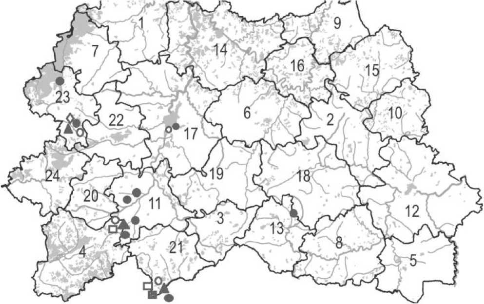 ■ - места встреч в 2012-2013 гг., □- места встреч в 2014-2015 гг.. ▲ -места встреч в 2016-2019 гг.. о - места встреч в 2020-2023 гг., • - места встреч в 2024-2025 гг., 0 - место гнездования, обнаруженное в 2025 г.