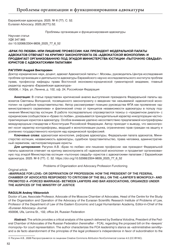 В статье представлен критический анализ выступления президента Федеральной палаты адвокатов Светланы Володиной, посвященного законопроекту о введении так называемой «адвокатской монополии» на судебное представительство. Автор рассматривает позицию руководства ФПА как проявление «административного сервилизма» и фактический отказ от принципов независимости адвокатуры в пользу подчинения Министерству юстиции. В работе последовательно опровергаются тезисы о «предметном диалоге» с юридическим сообществом и «браке по любви», доказывается принудительный характер инкорпорации частнопрактикующих юристов в адвокатуру. Особое внимание уделено несоответствию предлагаемой контрреформы международным стандартам и Конституции Российской Федерации. Автор приходит к выводу, что законопроект носит характер контрреформы, ведущей к монополизации рынка, ограничению прав граждан на защиту и усилению государственного контроля над юридической профессией.