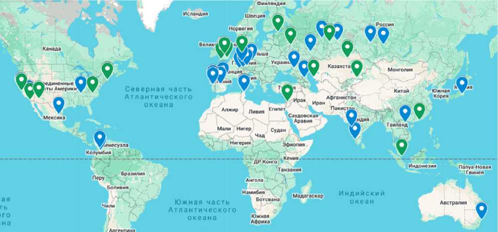 На рисунке 1 представлена география авторов научных публикаций, которые были проанализированы на предварительной стадии исследования (синие значки), и экспертов, принявших участие в глубинных интервью (зеленые значки). Исследование позволило собрать мнения широкого круга исследователей и практиков в области образования из 19 стран, 54 городов, 73 университетов и научно-образовательных центров, находящихся на 4 континентах и принадлежащих к разным национальным культурам.