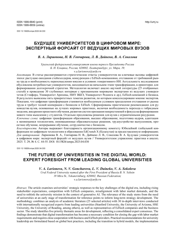 В статье рассматриваются стратегические ответы университетов на ключевые вызовы цифровой эпохи: растущие ожидания стейкхолдеров, конкуренция с EdTech-компаниями, отставание от требований рынка труда и необходимость переосмысления миссии в условиях генеративного ИИ. Актуальность исследования обусловлена потребностью университетов, находящихся на начальном этапе трансформации, в ориентирах для формирования долгосрочной стратегии. Методология включает анализ научной литературы (25 отобранных статей) и проведение 30 глубинных интервью с признанными мировыми экспертами из ведущих университетов (Стэнфорд, Университет Аризоны, НИУ ВШЭ, Университет Рединга и др.), EdTech-компаний и бизнеса. В результате выявлены пять приоритетных тематик развития, по которым консолидировано мнение экспертов. Показано, что цифровая трансформация становится необходимым условием преодоления отставания от рынка труда и требует тесной кооперации с бизнесом и EdTech. Сформированы практические рекомендации для руководства вузов, основанные на лучших мировых практиках, включая необходимость перехода к гибридным моделям, внедрения проектного обучения, развития систем признания микростепеней и фокуса на формировании нового типа мышления у студентов. Отдельно предложены решения для вузов с ограниченными ресурсами.