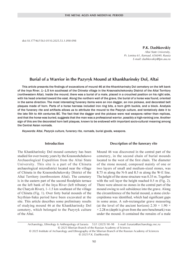 This article presents the findings of excavations of mound 46 at the Khankharinsky Dol cemetery on the left bank of the Inya River, 1–1.5 km southeast of the Chineta village in the Krasnoshchekovsky District of the Altai Territory (northwestern Altai). Inside the mound, there was a burial of a male, placed in a crouched position on his right side, with his head oriented toward the east. Along the northern wall of the grave, the burial of a horse was found, oriented in the same direction. The most interesting funerary items were an iron dagger, an iron pickaxe, and decorated belt plaques made of horn. Parts of a horse harness included iron ring bits, a horn girth buckle, and a block. Analysis of the funerary rite and artifacts allows us to attribute the mound to the Pazyryk culture, and tentatively date it to the late 5th to 4th centuries BC. The fact that the dagger and the pickaxe were real weapons rather than replicas, and that the horse was buried, suggests that the man was a professional warrior, possibly a high-ranking one. Another sign of this are the decorated horn belt plaques, known to be endowed with important socio-cultural meaning among the Central Asian nomads.