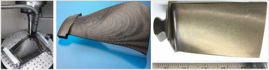 Fig. 1. CNC machining of a fiber-reinforced turbine blade, the machined part (Fraunhofer IPT, 2025) and a similar blade from an enterprise
