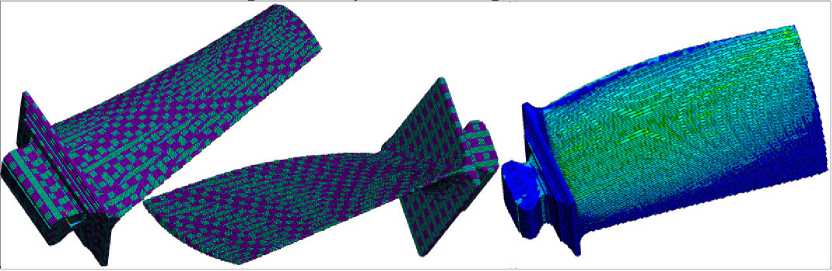 The described dependencies (1)–(5) make it possible to calculate the voxel mesh of the composite workpiece in the form of a rectangular parallelepiped. To generate the similar mesh for a part of arbitrary shape, it is necessary to use the dependencies given in our previously published studies [14] and Bulletin of the South Ural State University. Ser. Mechanical Engineering Industry. 2022, vol. 22, no. 4. In this case, the specified voxel state parameter should be determined using the dependencies (5), if this parameter is non-zero in calculations for the entire part according to the dependencies presented in the mentioned study [14]. The obtained voxel models are further transformed into finite element models. The results of modeling of the earlier described turbine blade are shown in Fig. 2 (for clarity, the dimensions of the fibers and the boundary layers are increased by an order of magnitude). The total number of finite elements is equal to 382 590. This number is relatively large and indicates the limitations of the proposed approach: it is applicable only for small parts. To calculate deformations in large-sized parts, it is advisable to use macro modeling with an equivalent homogeneous structure.